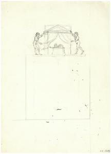 Due figure maschili sollevano un sipario. Disegno preparatorio per il frontespizio e testatina dei Supplementi a Comoedia, 1926, nn. 1-12
