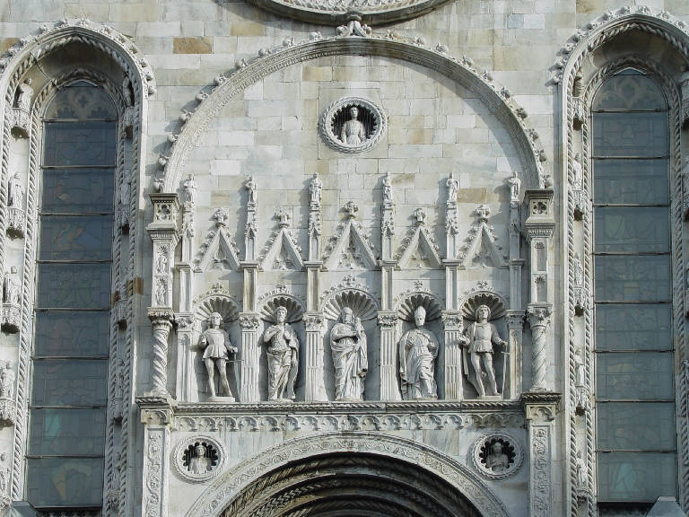 - NOTIZIE STORICO CRITICHE L'imponente facciata del Duomo di Como, portata a compimento nel corso del XV secolo, domina il centro storico cittadino, allineata al Broletto e al campanile, sull'area che ospitava l'antica chiesa di Santa Maria Maggiore. Felice esito della commistione di diversi stili, alla sua realizzazione hanno contribuito artisti di provenienza lombarda e ticinese, tra i quali si ricordano Fiorino da Bontà, Luchino Scarabota e Amizio da Lurago.\nDi significativa importanza, per la posizione di spicco al centro della fronte rispetto agli altri apparati, si rivela agli occhi dello spettatore il coronamento o "sovrapporta" che sormonta il portale maggiore, che restituisce un insieme composito per ricchezza e vastità di motivi figurativi e ornamentali, in grado di raccogliere più stili ma senza contrasti estetici. Il ritrovamento di alcune note di pagamento nei libri mastri della Fabbrica del Duomo consente di attribuire a Tommaso Rodari, già operante in veste di scultore dal 1484 e responsabile dell'intero cantiere dal 1487 al 1526, l'esecuzione e l'abbellimento di gran parte della statuaria presente sulla facciata. Le figure scolpite dal Rodari sarebbero state poi dipinte o dorate dai maestri Antonio de Peregrinis e Pietro figlio di Luchino Scarabota; residui delle dorature e tracce di colore che interessavano oggetti diversi e le vesti sono ancora oggi visibili grazie al recente intervento di pulitura delle superfici in marmo.