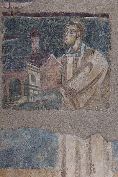- NOTIZIE STORICO CRITICHE Sul colle di Galliano, nei pressi di Cantù (CO), sorge la basilica di San Vincenzo. L'attuale edificio, costruito su un complesso del V secolo, è stato commissionato entro il 1007 da Ariberto da Intimiano (960/970-1045), allora custos del sito e suddiacono della Cattedrale milanese, come indicato da un'iscrizione dedicatoria murata nel perimetrale nord. Al tempo della fondazione risalgono le pitture dell'emiciclo absidale che terminano a sud con la figura del committente nell'atto di offrire idealmente a Cristo, posto nel semicatino dell'abside, il modello architettonico della basilica. Questo dettaglio, un tempo indicato da un'iscrizione, permette di comprendere meglio la sistemazione originaria dell'edificio, grazie alla riproduzione del campanile e del portico antistante l'ingresso. La parte superiore del dipinto mostra un aspetto di maggiore integrità rispetto alla zona bassa a causa dello strappo effettuato nel 1839 che ha consentito la sua protezione presso la Pinacoteca Ambrosiana di Milano sino al 1988, anno della ricollocazione in occasione della campagna di restauri. Il buono stato di conservazione permette di cogliere molti dettagli formali e stilistici che denotano l'ampio utilizzo di una tecnica mista e di apprezzare uno dei più alti esiti dell'intero ciclo: la monumentalità della posa e l'espressività del volto denunciano la conoscenza dei coevi fermenti artistici del mondo occidentale da parte di maestranze permeate da una tradizione classica. Sebbene le iscrizioni dipinte siano andate perdute, sono ancora osservabili alcuni graffiti obituari inerenti ad Ariberto e a tre parenti dello stesso.