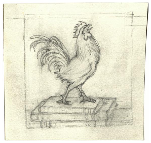 Gallo sopra una pila di libri (disegno preparatorio per Giovanni Papini, Politica e civiltà, Milano, Mondadori, 1963)