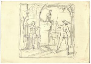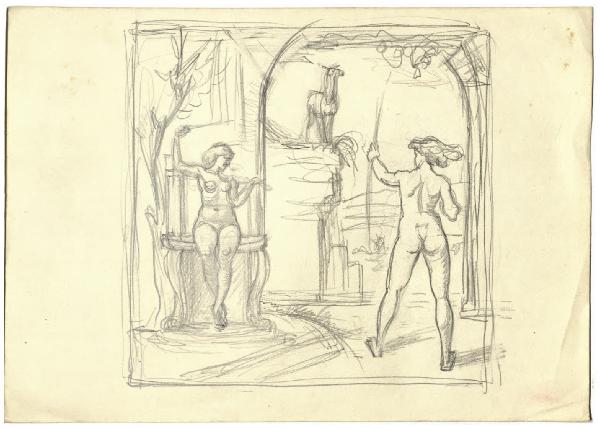 - NOTIZIE STORICO CRITICHE Nel 1950 Benvenuto Disertori ha presentato alla Biennale di Venezia un disegno dal titolo La cerba, datato 1944, raffigurante una scena dal contenuto enigmatico ambientata tra le rovine di una dimora, ispirata ad un verso dell'omonimo poema di Cecco d'Ascoli "La cerba en melodia se delecta, Si ch'una chacciatrice suona et chanta, et l'altra acerbamente la sajecta". Protagoniste della scena sono tre figure femminili nude: a destra una che sta per lanciare una freccia ad una cerva, a sinistra una seduta mentre suona il violino, infine l'ultima è distesa in primo piano. Il disegno fa oggi parte del Fondo Disertori al Gabinetto dei Disegni del Castello Sforzesco (inv. FD D 478; per un approfondimento cfr. G. Ricagni, La Cerba: l'enigma di un'allegoria, in "Grafica d'arte", 2003, pp. 30-32). Nella stessa collezione si conservano diversi studi per la composizione nel suo insieme oppure studi di figura. In stretta relazione con il soggetto di questo disegno sono due incisioni, entrambe rarissime e apparentemente non terminate (inv. FD S 10, Bellini-Alberti 53; FD S 17, Bellini-Alberti 57). Il legame tra tutte le opere riferibili in qualche modo al progetto La cerba non risulta, allo stato degli studi, adeguatamente documentato per le oggettive difficoltà a visionare, quando si trovavano nella collezione di Andrea Disertori, l'intera sequenza dei materiali. Non è da escludere che tutto fosse finalizzato alla realizzazione di un'incisione, di cui le due piccole lastre avrebbero potuto costituire un primo tentativo di traduzione sul rame. Per questa ragione, a questo primo livello di catalogazione, si propone per tutto il nucleo La cerba una datazione verso il 1944.