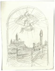 - NOTIZIE STORICO CRITICHE Il Pianeta Giove fa parte di una serie di acqueforti dedicata ai sette Pianeti, di cui Disertori ha effettivamente portato a termine solo l'intaglio di tre grandi lastre: Venere, 1924 (Bellini-Alberti 45), Giove, circa 1926 (Bellini-Alberti 44) e Mercurio, 1947-48 (Bellini-Alberti 61). Il Fondo Disertori del Gabinetto dei Disegni del Castello Sforzesco è ricchissimo di elaborati grafici afferenti a tale progetto, declinati dai primi abbozzi compositivi sino ai più finiti studi di dettaglio. In questo senso il Pianeta Giove (non datato ma realizzato entro la primavera del 1926, quando l'opera è stata presentata alla Biennale di Venezia) costituisce un esempio altamente rappresentativo. Le prime idee per il gruppo del pianeta possono rintracciarsi in un piccolo nucleo di studi a penna, tracciati su fogli di un quaderno a quadretti (inv. FD D 363, 383, 557, 1236 e 1950) con Giove assiso, in qualche caso cinto dall'abbraccio di Ganimede, mentre la prima idea compositiva per l'insieme si rintraccia in un bozzetto dove è già riconoscibile il profilo turrito della città di Siena (inv. FD D 180). Il primo pensiero per questa serie, di cui aveva immaginato inizialmente il Pianeta Venere, deve collocarsi nel 1923, quando l'artista si stabilisce a Firenze, come lui stesso ricorda in un racconto autobiografico (R. Maroni, Benevenuto Disertori Peregrinus de Tridento Incisore e umanista, Trento 1954, p. 28, "abitavo allora in Firenze"). \nLe diverse possibilità esplorate per la composizione del gruppo nel cielo (inv. FD D 1778; FD D 1792) prevedono tutte la presenza del segno zodiacale del Sagittario (casa principale del pianeta), quello dei Pesci (sua casa secondaria) e infine l'aquila. Diversi sono i fogli nei quali Disertori ha indagato attraverso studi di nudi maschili dal vero, la posa di Giove. Presente in collezione anche la veduta di Siena eseguita secondo la testimonianza dell'artista dal campanile dei Servi (Disertori in Maroni, 1954, p. 28), e in seguito rielaborata "in modo che la cattedrale apparisse ad uno sguardo contigua al Palazzo del Comune, a significare la dualità dei poteri spirituale e civico, soggetti al dominio dell'equanime iddio". Resta da comprendere la funzione dei numerosi ricalchi su carta da lucido tanto dei dettagli come della composizione d'insieme, che con una certa prudenza si propone di datare verso l'epoca di esecuzione della stampa.