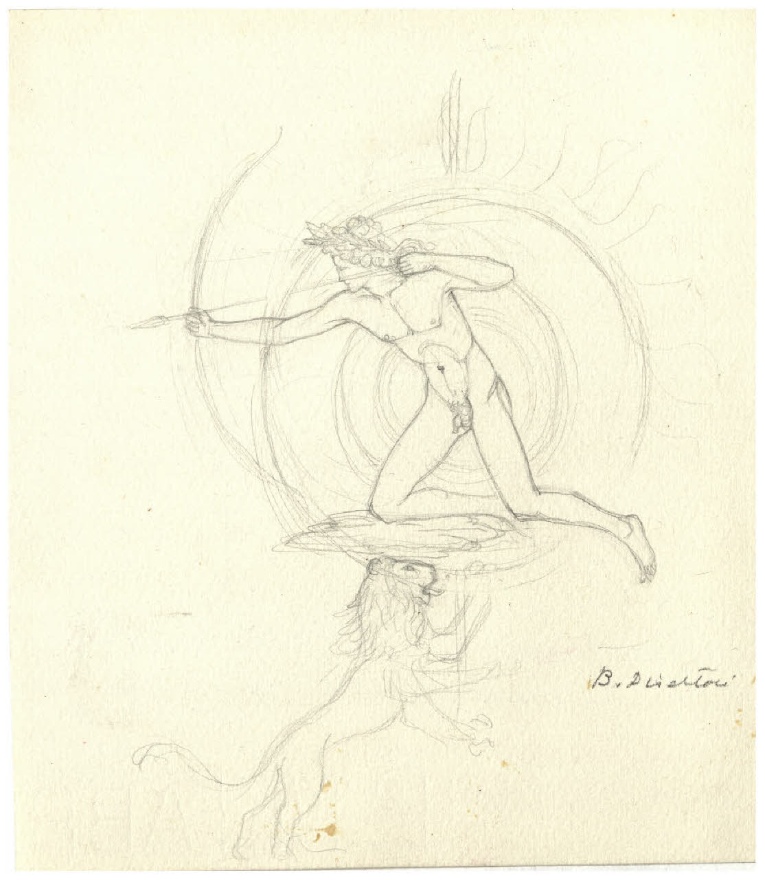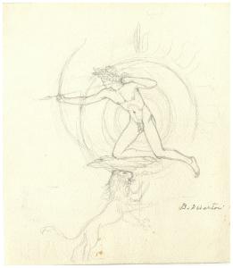 - NOTIZIE STORICO CRITICHE Questo disegno è in relazione con il processo di elaborazione del Pianeta Sole, che nelle intenzioni dell'artista avrebbe dovuto far parte della serie di acqueforti, interamente progettata ma solo in parte realizzata, dei Sette Pianeti. Tra le carte del Fondo Disertori al Gabinetto dei Disegni del Castello Sforzesco è probabile che le prime idee per il Sole risalgano al 1923, quando per testimonianza dell'incisore sarebbe nata l'idea della serie (R. Maroni, Benvenuto Disertori Peregrinus de Tridento incisore e umanista, Trento 1954, p. 28). Purtroppo, a differenza di altri Pianeti, come ad esempio Marte, al quale Disertori attese fino almento al 1954 (cfr. cat. Bellini-Alberti 2000, p. 58), non si hanno al momento tracce documentarie in grado di stabilire quando l'artista ha definitivamente abbandonato l'idea di tradurlo in stampa.\nI disegni del Fondo Disertori attestano diversi gradi di elaborazione, dai primi schizzi, in cui l'autore definisce a grandi linee l'impianto della scena che avrebbe dovuto comprendere in basso "una utopistica città idealizzata, materiata di platoniche armonie rinascimentali" (Disertori in Maroni 1954, cit.), attraverso una serie di soluzioni anche molto diverse tra loro, con il Sole-Apollo, sempre con l'arco teso, ma in piedi, fino al disegno più finito con il dio in ginocchio che punta la sua freccia verso il basso, con il sole sullo sfondo e sotto il segno zodiacale del Leone, sua casa principale (inv. FD D 441). Fuori dalle prime, sommarie delineazioni, nessuna traccia invece di quello che avrebbe dovuto essere il paesaggio in basso.