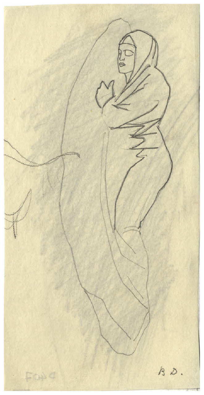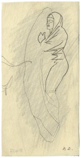 - NOTIZIE STORICO CRITICHE Questo disegno è in relazione con la genesi dell'acquaforte del 1947-1948 Il Pianeta Mercurio (Bellini-Alberti 61). La stampa mostra nella parte inferiore una veduta della zona industriale della Bovisa (per la quale si rinvia al contributo di Andrea Disertori, 2010) e nel cielo il Pianeta Mercurio in una posa scattante (simile a quella già esperita nel progetto del francobollo per la posta aerea del 1930; cfr. Salierno 1981) affiancato dai segni zodiacali della sua casa principale, la Vergine, e quella secondaria, i Gemelli. Attraverso il Fondo Disertori del Gabinetto dei Disegni del Castello Sforzesco si può seguire la genesi del soggetto, dai primi schizzi per la composizione, fino ai più analitici studi di dettaglio, compresa una serie di calchi su carta da lucido, dei quali ancora non è ben chiara la funzione.