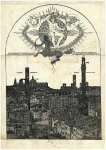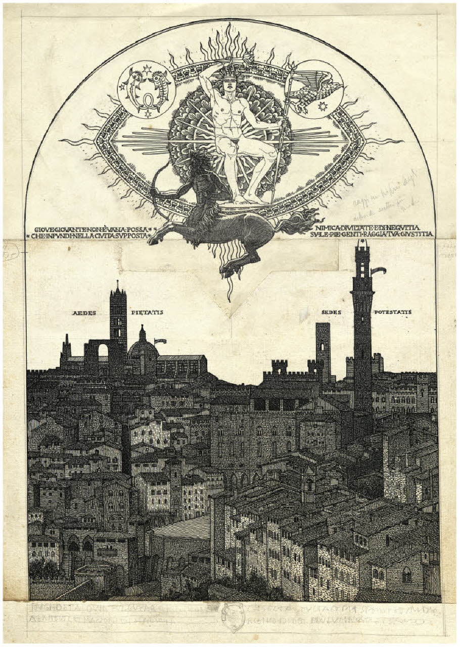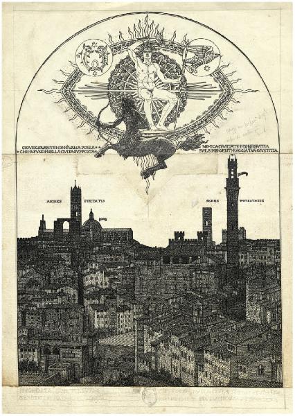 • NOTIZIE STORICO CRITICHE Il Pianeta Giove fa parte di una serie di acqueforti dedicata ai sette Pianeti, di cui Disertori ha effettivamente portato a termine solo l'intaglio di tre grandi lastre: Venere, 1924 (Bellini-Alberti 45), Giove, circa 1926 (Bellini-Alberti 44) e Mercurio, 1947-48 (Bellini-Alberti 61). Il Fondo Disertori del Gabinetto dei Disegni del Castello Sforzesco è ricchissimo di elaborati grafici afferenti a tale progetto, declinati dai primi abbozzi compositivi sino ai più finiti studi di dettaglio. In questo senso il Pianeta Giove (non datato ma realizzato entro la primavera del 1926, quando l'opera è stata presentata alla Biennale di Venezia) costituisce un esempio altamente rappresentativo. Le prime idee per il gruppo del pianeta possono rintracciarsi in un piccolo nucleo di studi a penna, tracciati su fogli di un quaderno a quadretti (inv. FD D 363, 383, 557, 1236 e 1950) con Giove assiso, in qualche caso cinto dall'abbraccio di Ganimede, mentre la prima idea compositiva per l'insieme si rintraccia in un bozzetto dove è già riconoscibile il profilo turrito della città di Siena (inv. FD D 180). Il primo pensiero per questa serie, di cui aveva immaginato inizialmente il Pianeta Venere, deve collocarsi nel 1923, quando l'artista si stabilisce a Firenze, come lui stesso ricorda in un racconto autobiografico (R. Maroni, Benevenuto Disertori Peregrinus de Tridento Incisore e umanista, Trento 1954, p. 28, "abitavo allora in Firenze"). \nLe diverse possibilità esplorate per la composizione del gruppo nel cielo (inv. FD D 1778; FD D 1792) prevedono tutte la presenza del segno zodiacale del Sagittario (casa principale del pianeta), quello dei Pesci (sua casa secondaria) e infine l'aquila. Diversi sono i fogli nei quali Disertori ha indagato attraverso studi di nudi maschili dal vero, la posa di Giove. Presente in collezione anche la veduta di Siena eseguita secondo la testimonianza dell'artista dal campanile dei Servi (Disertori in Maroni, 1954, p. 28), e in seguito rielaborata "in modo che la cattedrale apparisse ad uno sguardo contigua al Palazzo del Comune, a significare la dualità dei poteri spirituale e civico, soggetti al dominio dell'equanime iddio". Resta da comprendere la funzione dei numerosi ricalchi su carta da lucido tanto dei dettagli come della composizione d'insieme, che con una certa prudenza si propone di datare verso l'epoca di esecuzione della stampa.