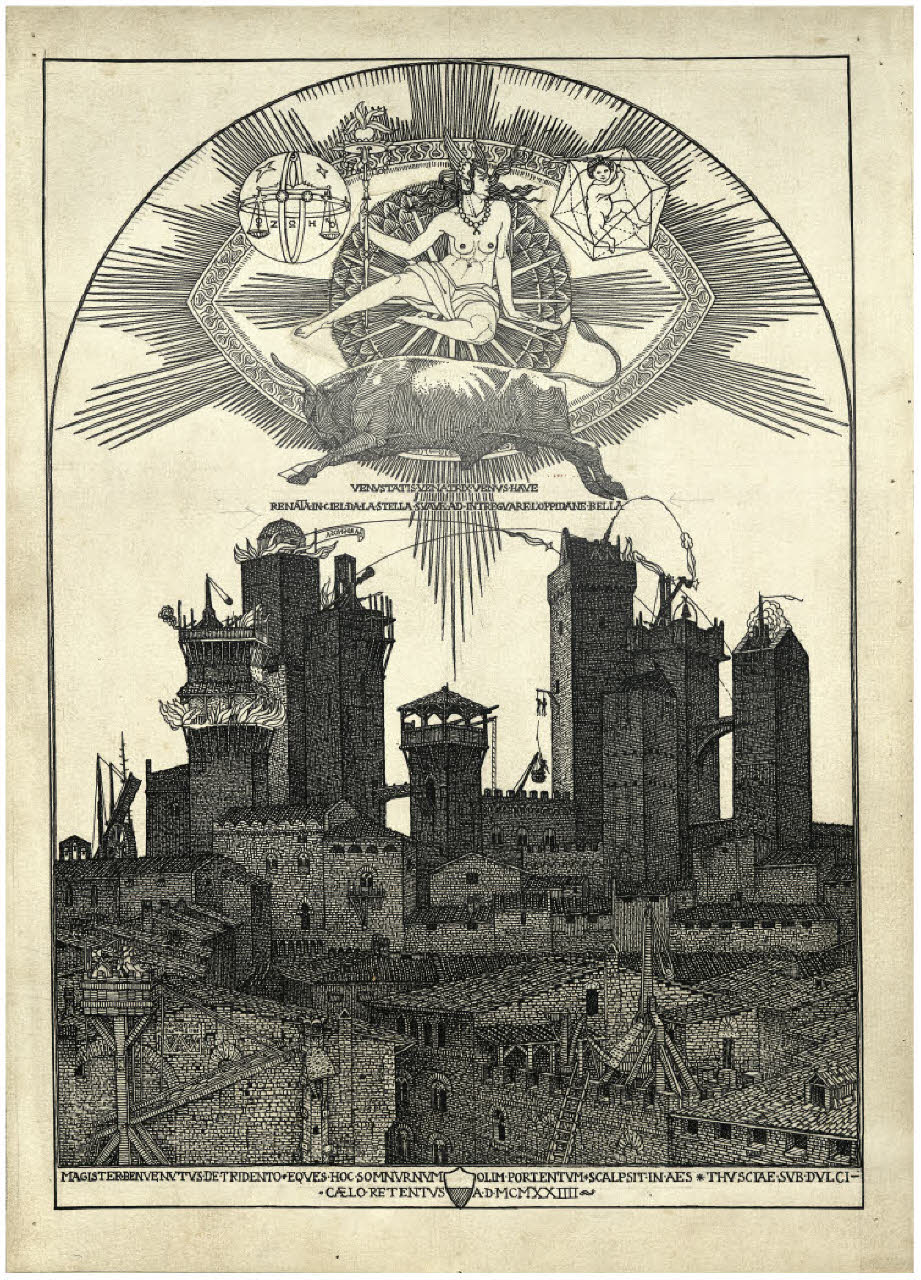 - NOTIZIE STORICO CRITICHE Questo disegno afferisce alla genesi dell'acquaforte Il Pianeta Venere (Bellini-Alberti 45). L'incisione è datata in lastra 1924 e in quell'anno fu esposta alla Biennale di Venezia. Le diverse fasi di elaborazione sono attestate da almeno un'ottantina di fogli nel Fondo Disertori del Gabinetto dei Disegni del Castello Sforzesco. Se si presta fede a quanto riferito dall'artista in un profilo autobiografico pubblicato da Riccardo Maroni nel 1954 (p. 28) la prima idea per una serie dedicata ai sette pianeti, a partire da Venere, risalirebbe al periodo in cui si trovava a Firenze (dove si era trasferito nel 1923). Questa cronologia sembrerebbe confermata da una nota manoscritta, "Firenze 1923" presente su almeno tre disegni, oggi conservati al Mart (inv. 2117, 2780, 2779; cat. Bellini-Alberti, fig. 45/a, 45/c e 45/d a p. 61). Non si spiega pertanto la data MDMXXI presente su inv. FD D 453. Difficile dire se tutti i disegni di nudo femminile che si propone qui di leggere in relazione con la preparazione dell'acquaforte risalgano proprio a questo momento, oppure se alcuni fossero precedenti. La veduta in basso è ispirata a San Gimignano, animata da una quantità di macchine belliche in molti casi ispirate al De re militari di Valturio. Nel cielo, entro una mandorla di luce Venere è assisa con in mano lo scettro, circondata dai segni zodiacali del Toro (sua casa principale), della Bilancia (casa secondaria) e infine di Cupido, che Disertori ha tratto da un bulino di Cristofano Robetta.