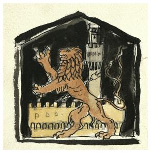 Leone rampante, sullo sfondo Palazzo della Signoria a Firenze (disegno preparatorio per la copertina di A. Ademollo, Marietta de' Ricci, Firenze, Nemi, 1930)