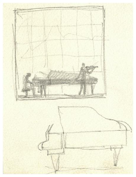 Interno con pianoforte davanti a una finestra. Studio per illustrazione