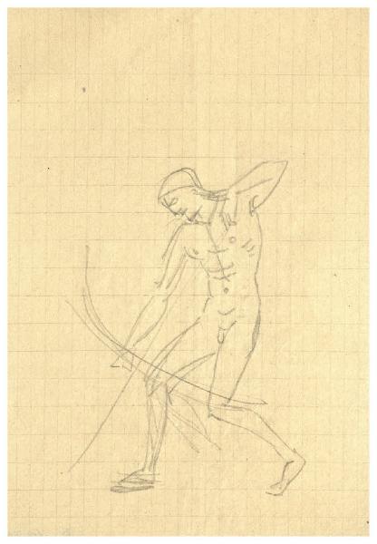- NOTIZIE STORICO CRITICHE Questo disegno è in relazione con il processo di elaborazione del Pianeta Sole, che nelle intenzioni dell'artista avrebbe dovuto far parte della serie di acqueforti, interamente progettata ma solo in parte realizzata, dei Sette Pianeti. Tra le carte del Fondo Disertori al Gabinetto dei Disegni del Castello Sforzesco è probabile che le prime idee per il Sole risalgano al 1923, quando per testimonianza dell'incisore sarebbe nata l'idea della serie (R. Maroni, Benvenuto Disertori Peregrinus de Tridento incisore e umanista, Trento 1954, p. 28). Purtroppo, a differenza di altri Pianeti, come ad esempio Marte, al quale Disertori attese fino almento al 1954 (cfr. cat. Bellini-Alberti 2000, p. 58), non si hanno al momento tracce documentarie in grado di stabilire quando l'artista ha definitivamente abbandonato l'idea di tradurlo in stampa.\nI disegni del Fondo Disertori attestano diversi gradi di elaborazione, dai primi schizzi, in cui l'autore definisce a grandi linee l'impianto della scena che avrebbe dovuto comprendere in basso "una utopistica città idealizzata, materiata di platoniche armonie rinascimentali" (Disertori in Maroni 1954, cit.), attraverso una serie di soluzioni anche molto diverse tra loro, con il Sole-Apollo, sempre con l'arco teso, ma in piedi, fino al disegno più finito con il dio in ginocchio che punta la sua freccia verso il basso, con il sole sullo sfondo e sotto il segno zodiacale del Leone, sua casa principale (inv. FD D 441). Fuori dalle prime, sommarie delineazioni, nessuna traccia invece di quello che avrebbe dovuto essere il paesaggio in basso.