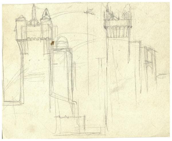 Torri di San Gimignano con macchine belliche. Disegno preparatorio per l'acquaforte Il Pianeta Venere