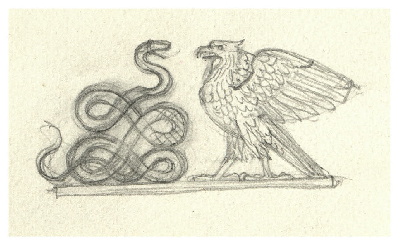 - NOTIZIE STORICO CRITICHE Il motivo dell'Aquila che lotta con un serpente è stato trattato da Disertori in diversi disegni presenti nel Fondo Disertori del Gabinetto dei Disegni del Castello Sforzesco. Come sempre, non è purtroppo possibile stabilire una precisa relazione funzionale tra questi e dunque la loro esatta cronologia, specialmente per quanto concerne i ricalchi su carta da lucido.\nUn primo elemento certo è dato dall'impiego dell'immagine nel 1929 sulla copertina di Robert Emmet Sherwood, Annibale alle porte, Milano, Mondadori, 1929 (Fondo Disertori, FD S 31). Rispetto a questo, il disegno qui catalogato si colloca plausibilmente come foglio di studio, precedente la versione più finita (inv. FD D 2964).