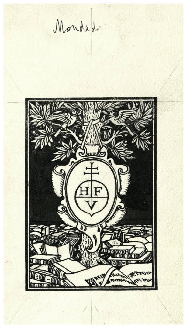 Scudo appeso a un albero circondato da libri (disegno preparatorio per l'ex libris per H. F. V.)