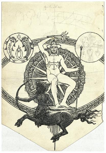 - NOTIZIE STORICO CRITICHE Il Pianeta Giove fa parte di una serie di acqueforti dedicata ai sette Pianeti, di cui Disertori ha effettivamente portato a termine solo l'intaglio di tre grandi lastre: Venere, 1924 (Bellini-Alberti 45), Giove, circa 1926 (Bellini-Alberti 44) e Mercurio, 1947-48 (Bellini-Alberti 61). Il Fondo Disertori del Gabinetto dei Disegni del Castello Sforzesco è ricchissimo di elaborati grafici afferenti a tale progetto, declinati dai primi abbozzi compositivi sino ai più finiti studi di dettaglio. In questo senso il Pianeta Giove (non datato ma realizzato entro la primavera del 1926, quando l'opera è stata presentata alla Biennale di Venezia) costituisce un esempio altamente rappresentativo. Le prime idee per il gruppo del pianeta possono rintracciarsi in un piccolo nucleo di studi a penna, tracciati su fogli di un quaderno a quadretti (inv. FD D 363, 383, 557, 1236 e 1950) con Giove assiso, in qualche caso cinto dall'abbraccio di Ganimede, mentre la prima idea compositiva per l'insieme si rintraccia in un bozzetto dove è già riconoscibile il profilo turrito della città di Siena (inv. FD D 180). Il primo pensiero per questa serie, di cui aveva immaginato inizialmente il Pianeta Venere, deve collocarsi nel 1923, quando l'artista si stabilisce a Firenze, come lui stesso ricorda in un racconto autobiografico (R. Maroni, Benevenuto Disertori Peregrinus de Tridento Incisore e umanista, Trento 1954, p. 28, "abitavo allora in Firenze"). \nLe diverse possibilità esplorate per la composizione del gruppo nel cielo (inv. FD D 1778; FD D 1792) prevedono tutte la presenza del segno zodiacale del Sagittario (casa principale del pianeta), quello dei Pesci (sua casa secondaria) e infine l'aquila. Diversi sono i fogli nei quali Disertori ha indagato attraverso studi di nudi maschili dal vero, la posa di Giove. Presente in collezione anche la veduta di Siena eseguita secondo la testimonianza dell'artista dal campanile dei Servi (Disertori in Maroni, 1954, p. 28), e in seguito rielaborata "in modo che la cattedrale apparisse ad uno sguardo contigua al Palazzo del Comune, a significare la dualità dei poteri spirituale e civico, soggetti al dominio dell'equanime iddio". Resta da comprendere la funzione dei numerosi ricalchi su carta da lucido tanto dei dettagli come della composizione d'insieme, che con una certa prudenza si propone di datare verso l'epoca di esecuzione della stampa.