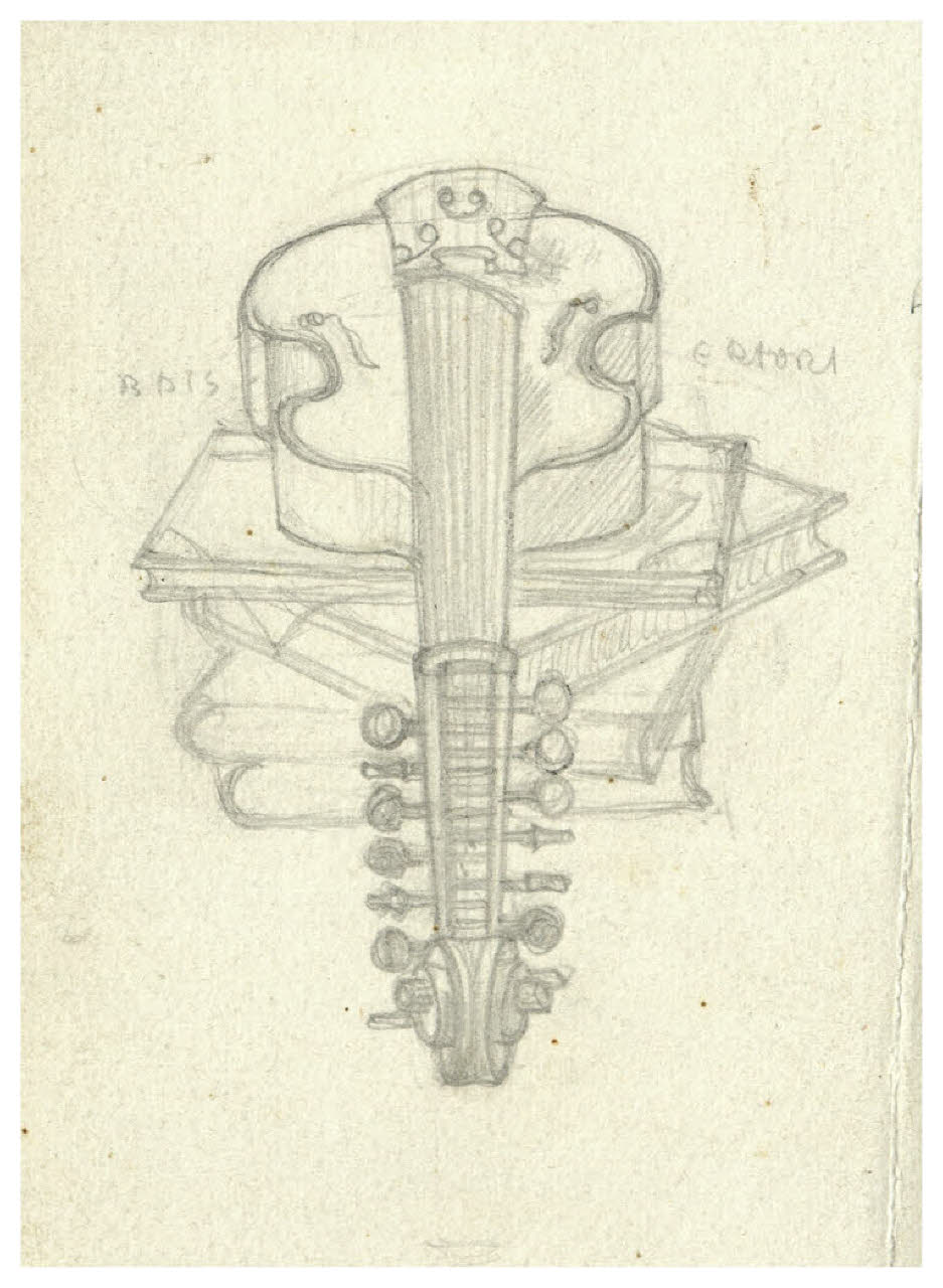 Violino posato su alcuni libri. Disegno preparatorio per la copertina di Virgilio Brocchi, Gli occhi limpidi, Milano, Mondadori, 1930