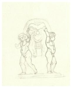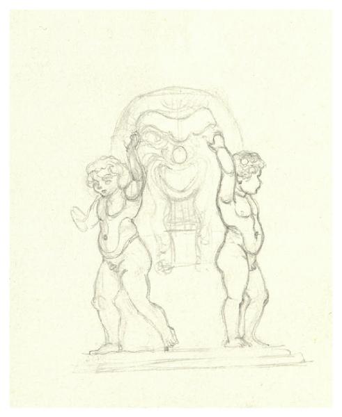 Due putti ai lati di un mascherone. Disegno preparatorio per la copertina di George Bernard Shaw, La prima commedia di Fanny, Milano, Mondadori, 1928