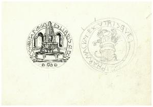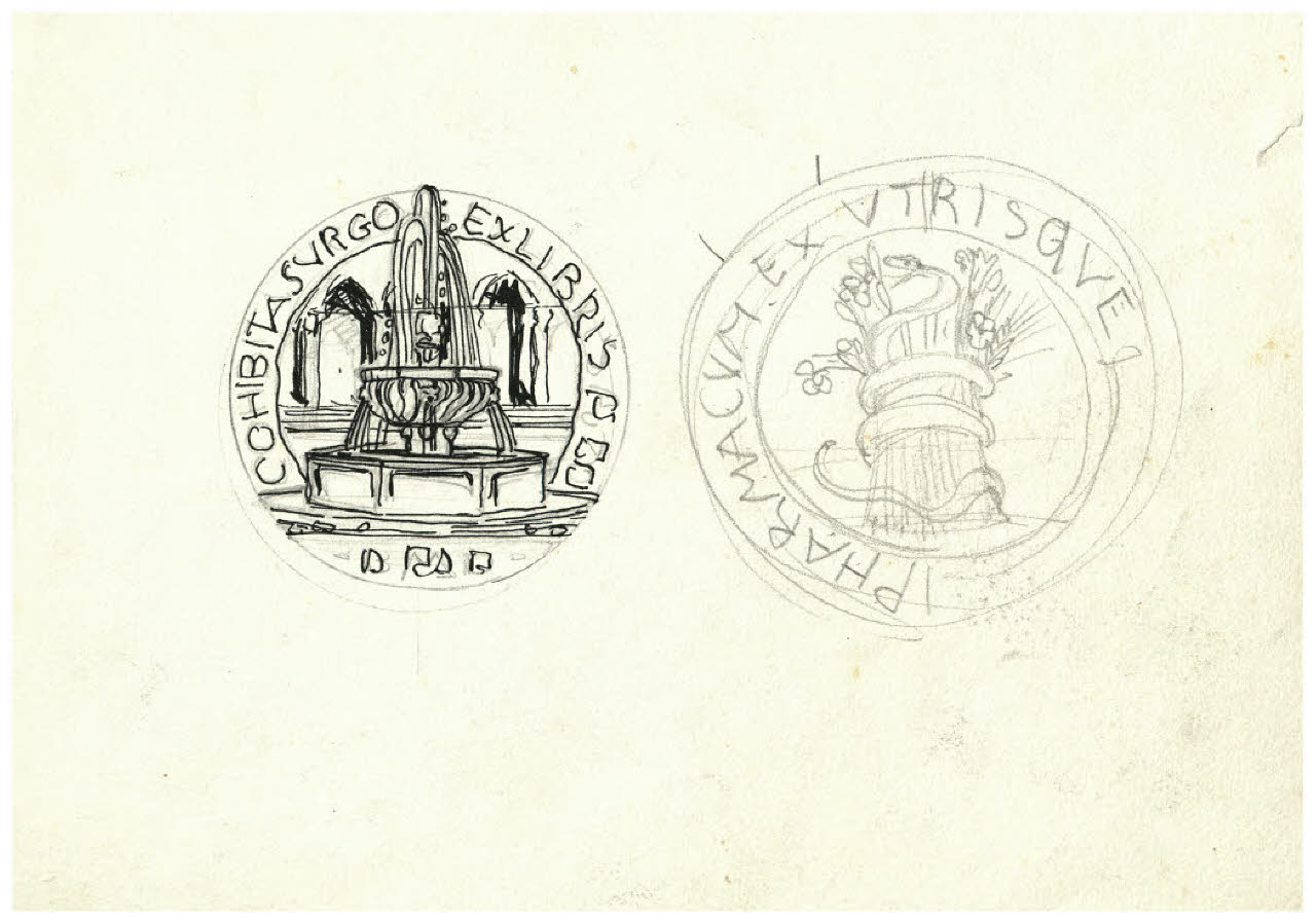 Fontana - Cohibita surgo (studio per ex libris); Serpente che avvolge con le sue spire un mazzo di fiori - Pharmacum ex utrisque (studio per emblema)