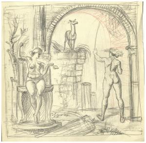 - NOTIZIE STORICO CRITICHE Nel 1950 Benvenuto Disertori ha presentato alla Biennale di Venezia un disegno dal titolo La cerba, datato 1944, raffigurante una scena dal contenuto enigmatico ambientata tra le rovine di una dimora, ispirata ad un verso dell'omonimo poema di Cecco d'Ascoli "La cerba en melodia se delecta, Si ch'una chacciatrice suona et chanta, et l'altra acerbamente la sajecta". Protagoniste della scena sono tre figure femminili nude: a destra una che sta per lanciare una freccia ad una cerva, a sinistra una seduta mentre suona il violino, infine l'ultima è distesa in primo piano. Il disegno fa oggi parte del Fondo Disertori al Gabinetto dei Disegni del Castello Sforzesco (inv. FD D 478; per un approfondimento cfr. G. Ricagni, La Cerba: l'enigma di un'allegoria, in "Grafica d'arte", 2003, pp. 30-32). Nella stessa collezione si conservano diversi studi per la composizione nel suo insieme oppure studi di figura. In stretta relazione con il soggetto di questo disegno sono due incisioni, entrambe rarissime e apparentemente non terminate (inv. FD S 10, Bellini-Alberti 53; FD S 17, Bellini-Alberti 57). Il legame tra tutte le opere riferibili in qualche modo al progetto La cerba non risulta, allo stato degli studi, adeguatamente documentato per le oggettive difficoltà a visionare, quando si trovavano nella collezione di Andrea Disertori, l'intera sequenza dei materiali. Non è da escludere che tutto fosse finalizzato alla realizzazione di un'incisione, di cui le due piccole lastre avrebbero potuto costituire un primo tentativo di traduzione sul rame. Per questa ragione, a questo primo livello di catalogazione, si propone per tutto il nucleo La cerba una datazione verso il 1944.