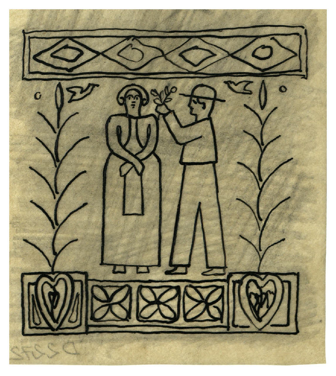 Figure stilizzate e motivo decorativo. Disegno preparatorio per la copertina di Lina Pietravalle, Storie di paese, Milano, Mondadori, 1930