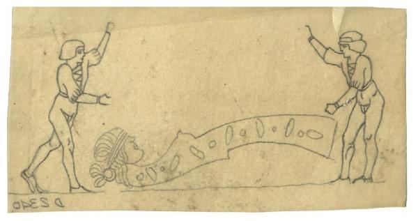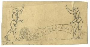 Due figure maschili nel gesto di aprire un sipario. Disegno preparatorio per il frontespizio e testatina dei Supplementi a Comoedia, 1926, nn. 1-12; Mascherone