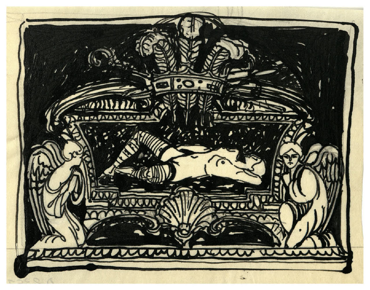 Nudo femminile disteso e due figure in preghiera (variante di studio per l'ex libris per Vittorio Pica)