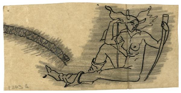 - NOTIZIE STORICO CRITICHE Questo disegno è in relazione con la genesi del progetto Il Pianeta Luna, destinato nelle intenzioni dell'artista ad essere inciso per una serie dedicata ai Sette Pianeti (Bellini-Alberti 2000, p. 28). Come la maggior parte di essi il disegno non è mai stato tradotto in stampa. Attraverso le carte del Fondo Disertori del Gabinetto dei Disegni del Castello Sforzesco se ne può seguire lo sviluppo dai primi concetti di sintesi (come FD D 836 v.), nelle diverse varianti esplorate (es. FD D 1118 v.), fino a una più determinata visione d'insieme (FD D 427) e ai dettagliatissimi studi a penna per la mandorla dove la dea siede con accanto il segno zodiacale del Cancro e ai suoi piedi una gazzella, con riferimento alle attività di caccia, presiedute da Diana. Di particolare interesse un gruppo di fogli (FD D 429 r. e v., FD D 430 r. e v., FD D 431) con abbozzate diverse vedute di Venezia, con il cielo già pensato per accogliere la divinità. Come ha spiegato l'artista in uno scritto autobiografico (Cfr. Maroni, 1954, p. 28), per il paesaggio sottostante la scelta di Venezia è dipesa dal fatto che "la Luna, signora delle maree" avrebbe dovuto sovrastare "una città anadiomene".