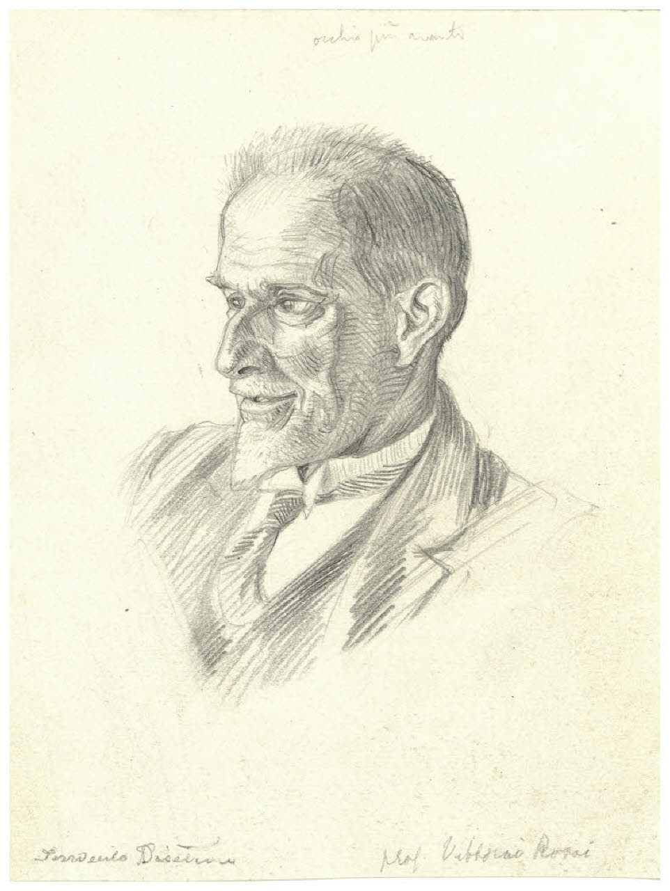 - NOTIZIE STORICO CRITICHE La cronologia verso il 1940 proposta per questo ritratto (nella versione a penna) nel catalogo Del Prato-Salvadori non è coerente con gli estremi del personaggio raffigurato, lo storico della letteratura italiana Vittorio Rossi (Venezia, 1865-Roma, 1938). Se non si tratta di un ritratto postumo la datazione è da anticipare entro il 1938.