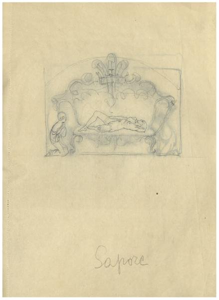Nudo femminile disteso su un divano, in primo piano una figura in adorazione - Sapore. Studio per ex libris