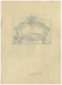 - NOTIZIE STORICO CRITICHE L'album del quale fa parte questo disegno contiene almeno due soggetti, il ritratto di Antonio Rizzi preparatorio per la xilografia datata 1916 (carta 1; Bellini-Alberti 88), e lo studio per un'illustrazione apparsa sul numero di settembre del 1916 (carta 7), che forniscono un utile termine per fissarne la cronologia.\nQuesto soggetto è stato ripreso con varianti (senza le due figure in primo piano e una corona al posto delle piume) in un ex libris per Vittorio Pica del 1918 (Bellini-Alberti 104). Forse inizialmente lo aveva pensato come ex libris per Francesco Sapori: sono indizi in tal senso la scritta Sapore presente su questa carta, e la presenza alla carta 9 di uno studio per l'ex libris di Sapori del 1916 (Bellini-Alberti 102).