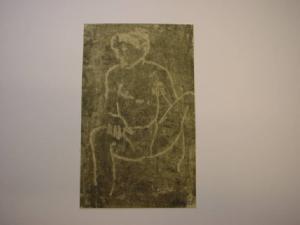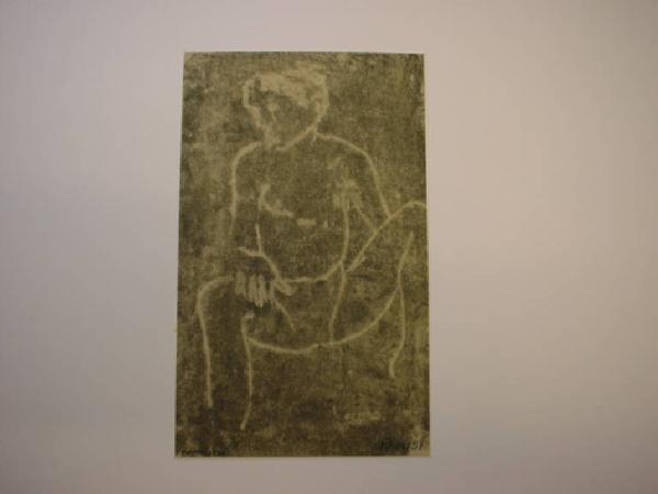 Una figura virile accovacciata a gambe divaricate e a torso nudo è definita attraverso una semplice e ferma linea di contorno.