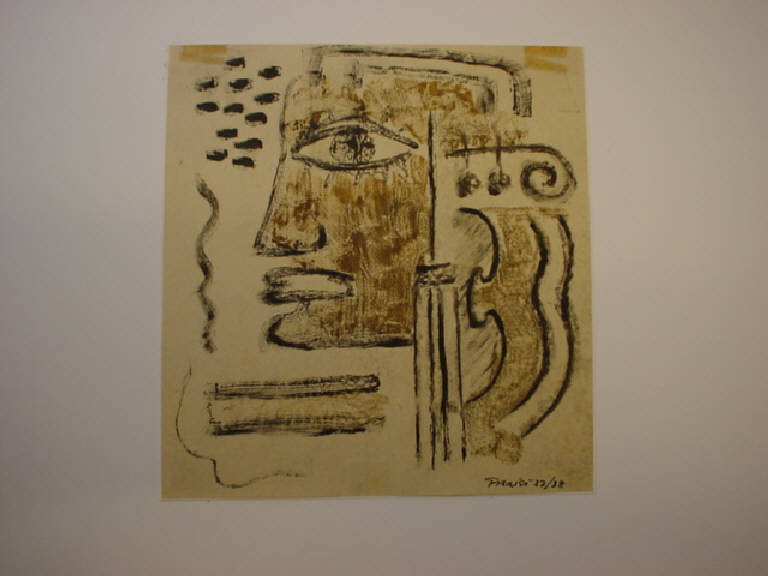 In forma molto stilizzata e deliberatamente "arcaica" è rappresentata una testa maschile di profilo a cui si sovrappone parzialmente la silhoutte di un violino. Viene usato il colore nero per i contorni, e il giallo ocra per le campiture interne.