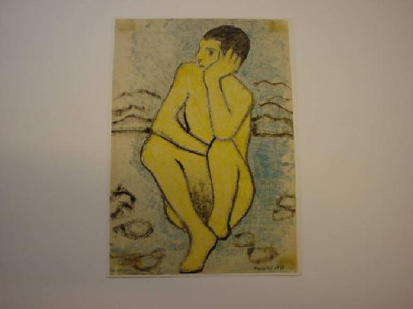 Una figura virile ignuda, seduta per terra a gambe piegate e leggermente divaricate, è definita attraverso una semplice e ferma linea di contorno. Il soggetto appoggia la testa, rappresentata di profilo, sulla mano, in atteggiamento pensoso. L'ambientazione è marina