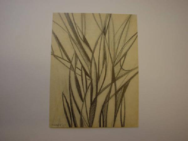 Linee di colore nero e grigio sfumato, ad andamento paraboloide ed obliquo, si intersecano fra di loro suggerendo la forma di un cespuglio di rami e foglie.
