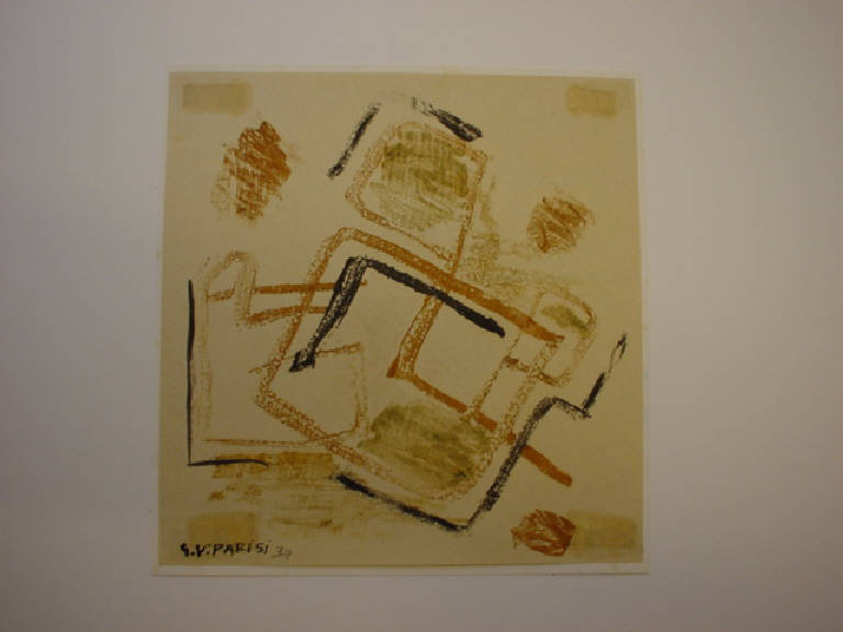 Linee nere e di colore terra oblique formano segmenti spezzati e figure geometriche in parte campite da colore verde.