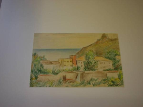 Composizione paesaggistica definita per mezzo di un tratteggio compendiario e indirizzato alla definizione geometrica dei volumi delle case. In primo piano una distesa di erba incolta, seguita da un gruppo di abitazioni e da una collina. Sullo sfondo il mare