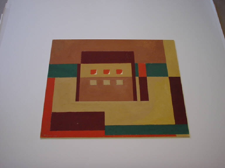 Lo spazio del foglio è ripartito in ampie zonature rettangolari di diverse dimensioni, colorate in verde e rosso in diverse tonalità, secondo una libera combinazione modulare. La giustapposizione degli elementi è simmetrica rispetto ad un asse orizzontale centrale