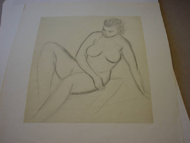 Il disegno rappresenta un nudo femminile seduto a gambe parzialmente distese. La modella è posizionata di tre quarti rispetto all'osservatore. La parte inferiore degli arti non è definita. Il disegno è realizzato con tratto spesso e deciso per i contorni,