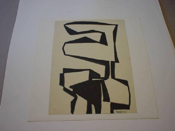 Il lavoro consiste nella composizione di una forma pseudogeometrica attraverso l'uso di una linea dallo spessore variabile e sagomato.