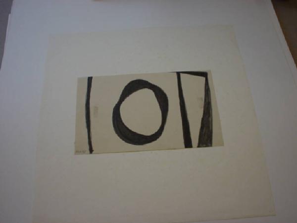 Con linee a forte spessore irregolare è tracciato un cerchio al centro e due linee verticali a destra e a sinistra del foglio. Sulla destra è presente un'altra linea angolata che si interseca con la verticale adiacente. Il tutto è realizzato ad inchiostro