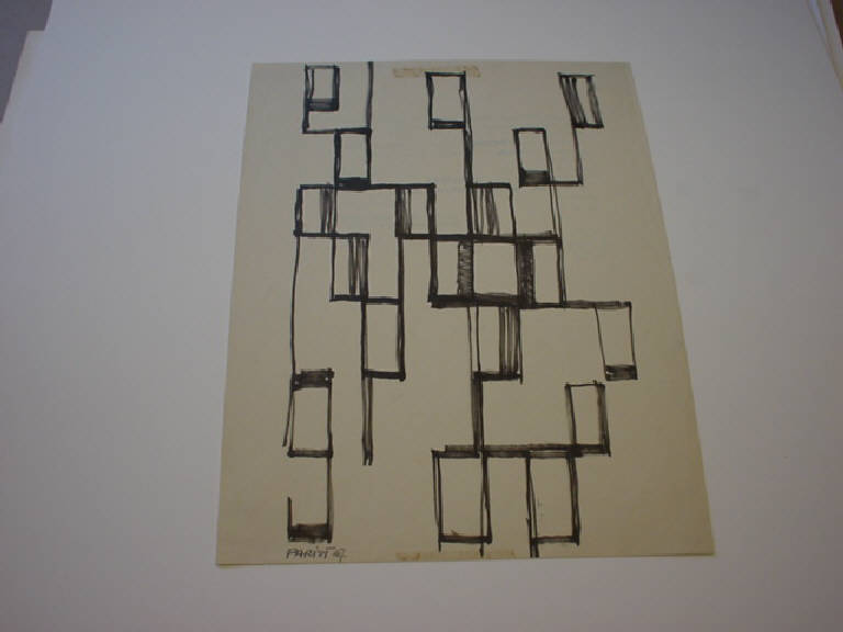 E' una composizione fantastica di linee e moduli irregolari, con prevalenza della forma circolare ed ellissoidale, di colore nero, che campiscono totalmente il piano avorio del disegno.