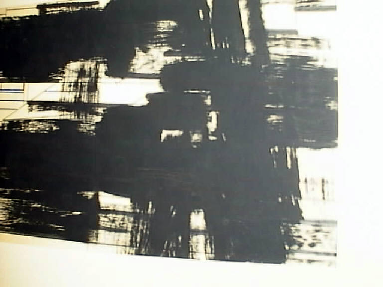 Con l'uso di spatolate spesse sono stese pennellate nere in direzione prevalentemente verticale e orizzontale. Lo sfondo è trattato con disegni geometrici