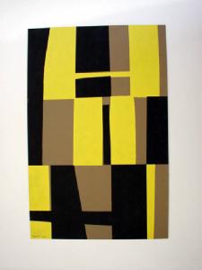 Campiture rettangolari e trapezoidale allungate in verticale di diverso colore (nero, beige, giallo) sono accostate fra loro, e interrotte da rare linee orizzontali di colore scuro.