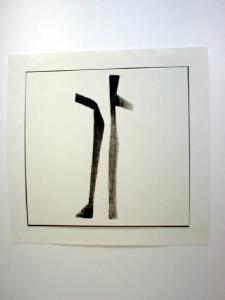 Con l'uso di inchiostro diversamente diluito è tracciato un segno calligrafico di reminiscenza orientale, incorniciato da un sottile bordo blu, ottenuto attraverso la controfondatura del foglio bianco di base con un cartoncino colorato.