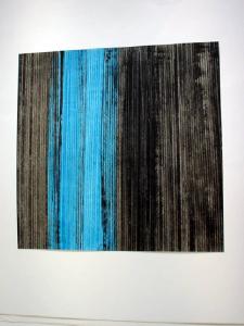 Una sequenza di linee verticali parallele e fitte, in tempera nera, occupa l'intero piano dell'opera, quasi quadrato. Quasi al centro una fascia centrale di righe altrettanto fitte di azzurro intenso