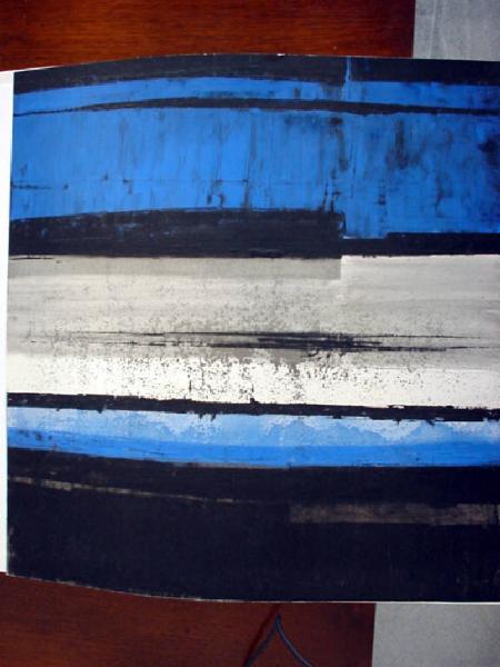 Il piano è occupato da una fitta sequenza di spatolate orizzontali di colore nero, azzurro e grigio - alcune tracciate in negativo, ovvero levando il colore con la lamina