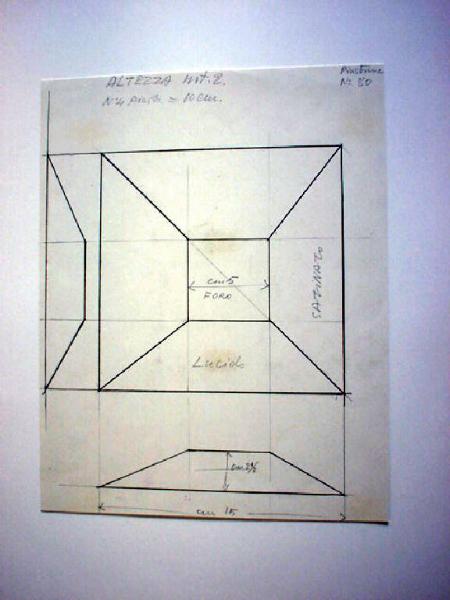 Raffigura in pianta un opera modulare tridimensionale di cui sono indicate le dimensioni ed il numero dei moduli. In basso il disegno dei moduli.