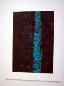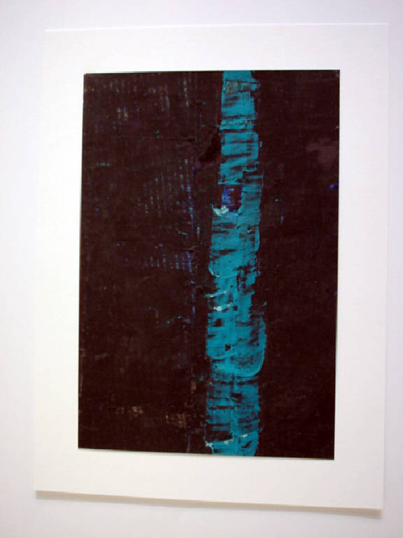 Una fascia dai contorni irregolari di colore azzurro si staglia in verticale sulla zona destra del foglio, per il resto capito da colore marrone