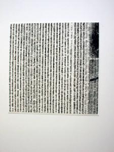 L'autore applica le potenzialità e le espressività dei segni verticali anche ad "altro" rispetto alla sua produzione. In questo caso ha capovolto a 90° rispetto al senso di lettura un testo (di critica d'arte), e ne ha sovrapposto un altro avente lo stesso senso