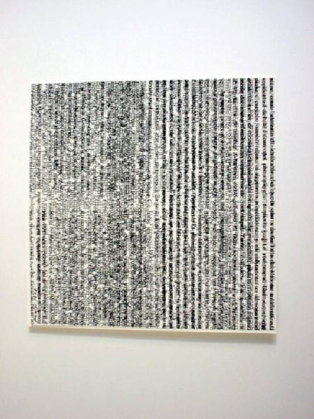 L'autore applica le potenzialità e le espressività dei segni verticali anche ad "altro" rispetto alla sua produzione. In questo caso ha capovolto a 90° rispetto al senso di lettura un testo (di critica d'arte), e ne ha sovrapposto un altro avente lo stesso senso
