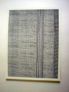 Entro un'area rettangolare texturizzata, al centro e leggermente spostate a destra, sono tracciate a tutta altezza linee parallele di diverso spessore e tonalità - una delle quali a bordo dentellato - nel rispetto della dissimmetria dinamica.