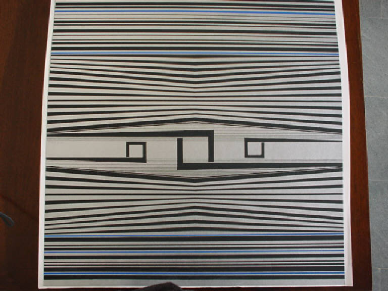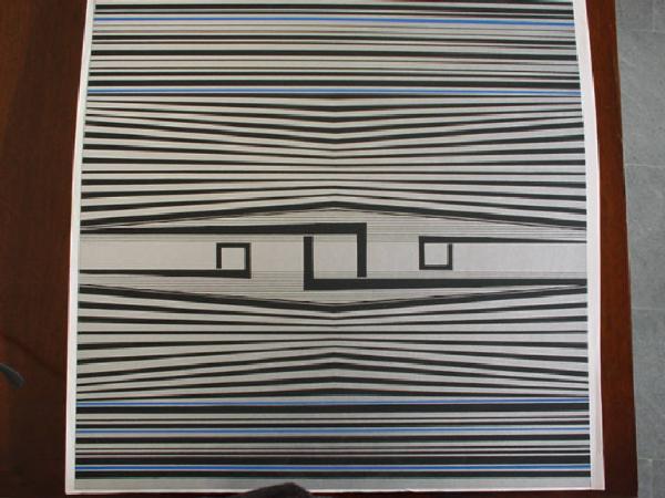 Su di un fondo color bianco si dispongono linee di diverso spessore in color nero e azzurro che, perfettamente verticali alle due estremità, tendono ad assumere un leggero andamento obliquo convergente verso il centro, formando un modulo pseudo poligonale